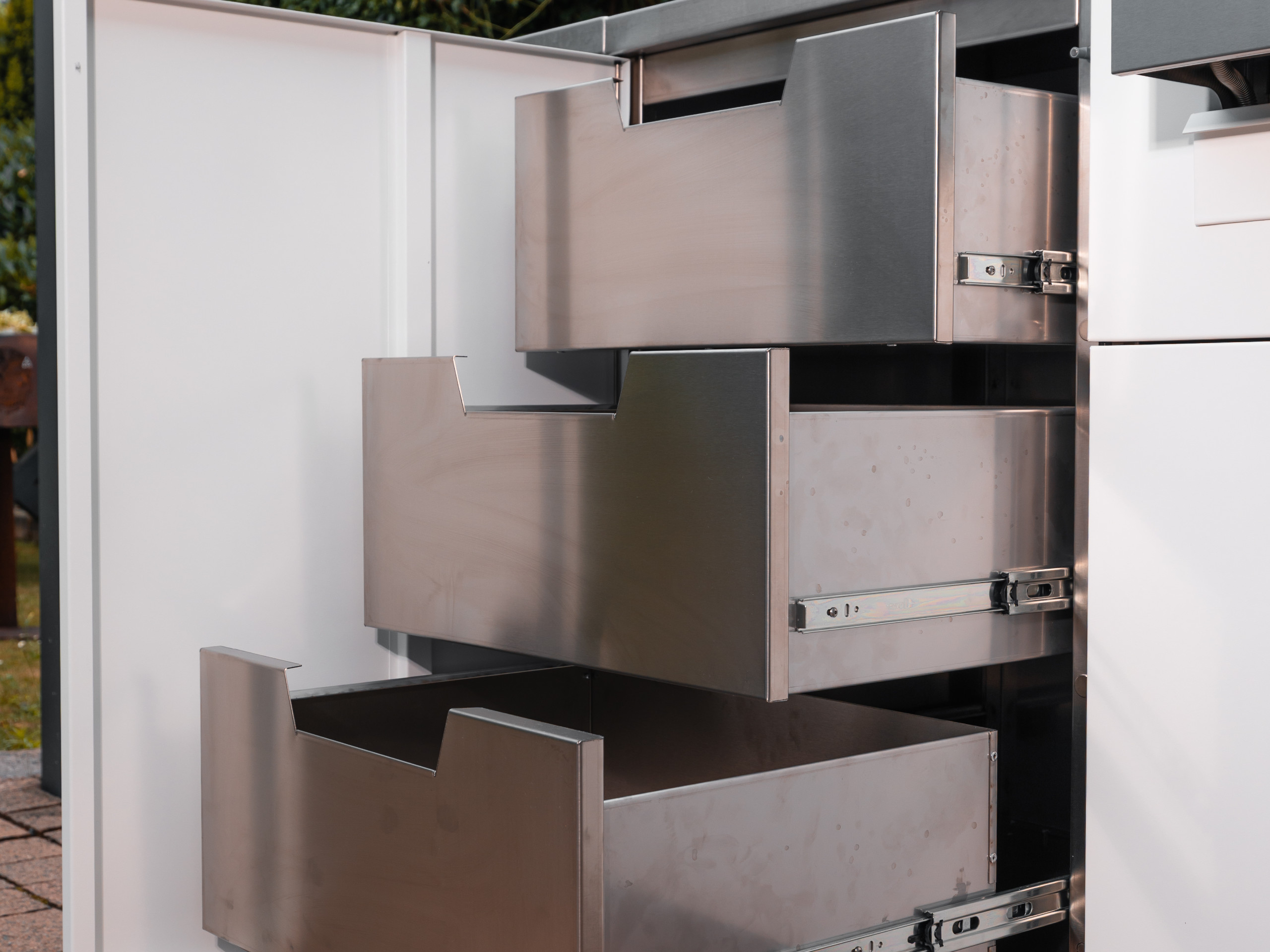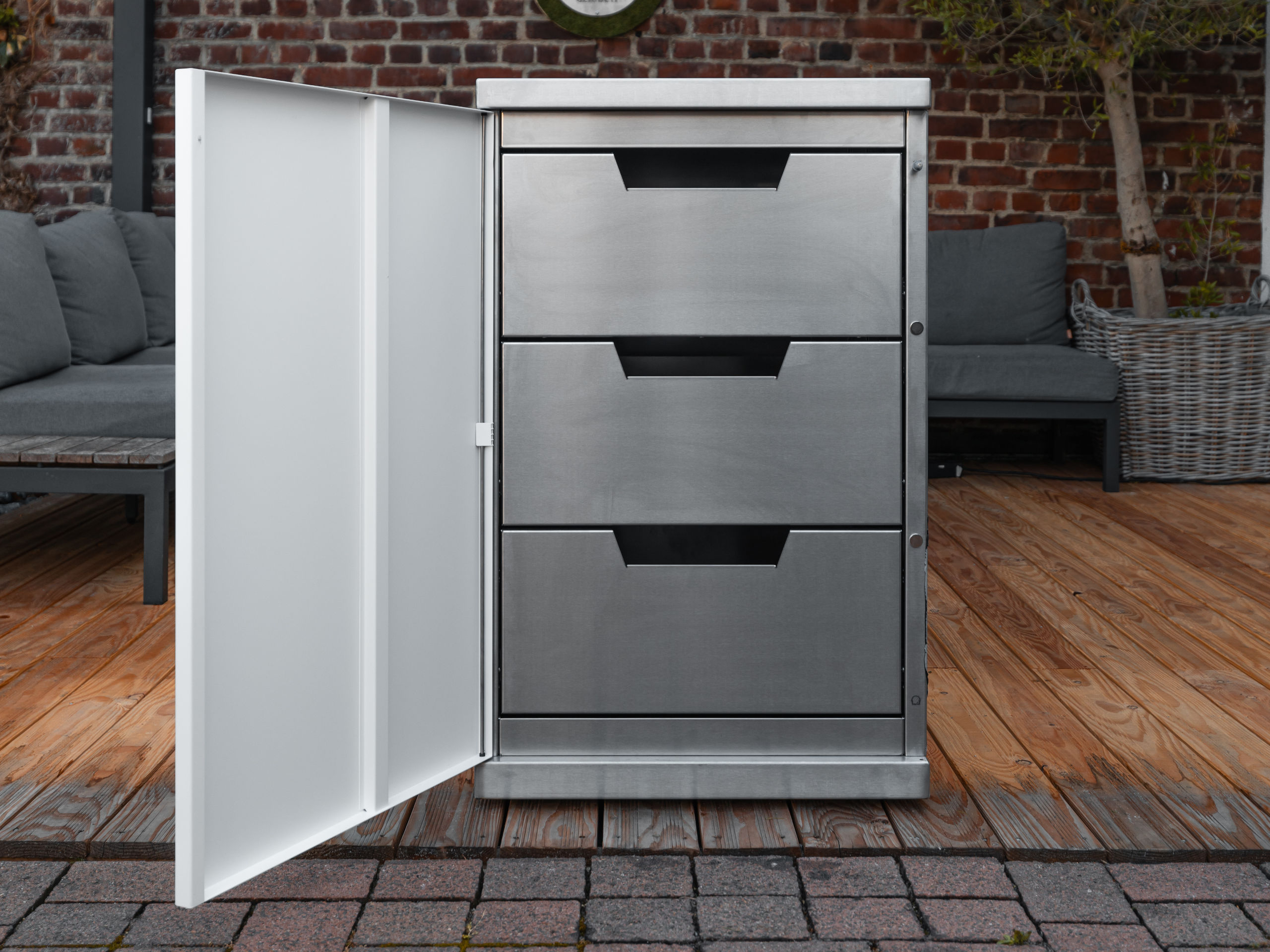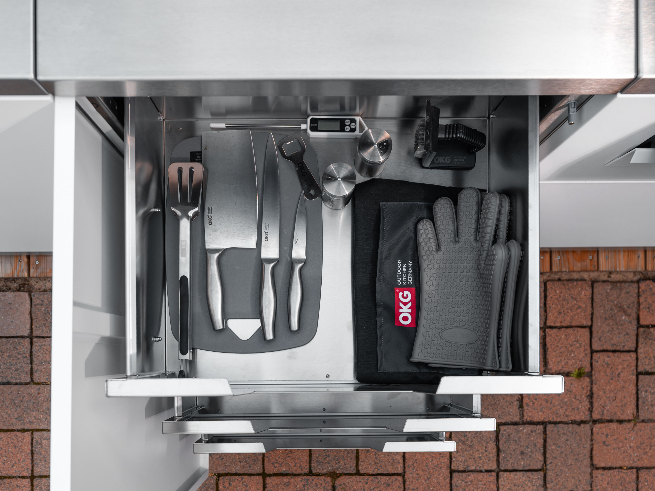 Mit dem OKG storage one hast du alles griffbereit, was du beim Kochen im Freien brauchst. Das Stauraum-Modul bietet drei großzügige Schubladen mit integrierten Griffausfräsungen – schlicht im Design, robust in der Handhabung und angenehm ergonomisch. Eine schwarze Frontklappe schützt den Inhalt vor Witterung und sorgt für eine aufgeräumte Optik.