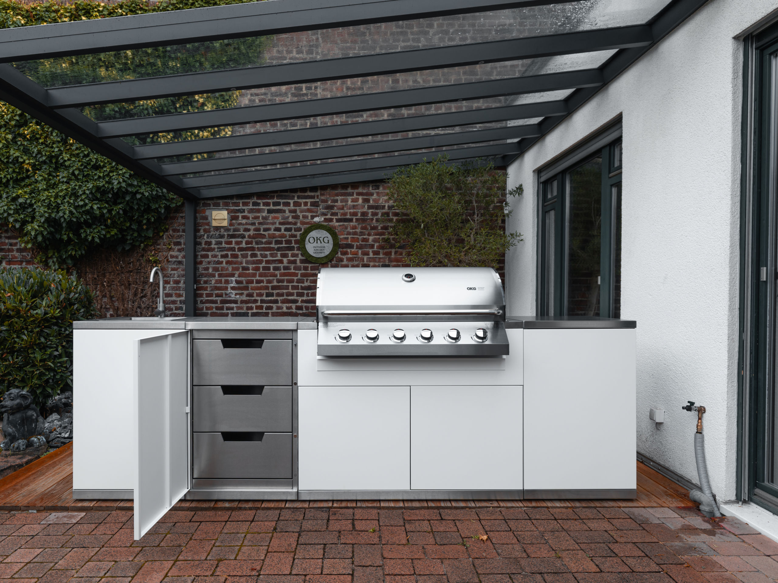 Mit einem Korpus aus hochwertigem Edelstahl, teils pulverbeschichtet, ist das storage one wetterfest, pflegeleicht und perfekt für den dauerhaften Einsatz im Außenbereich geeignet. Über das Click & Cook™ System lässt sich das Modul schnell und werkzeugfrei in die OKG classic one integrieren – aufstellen, verbinden, nutzen.