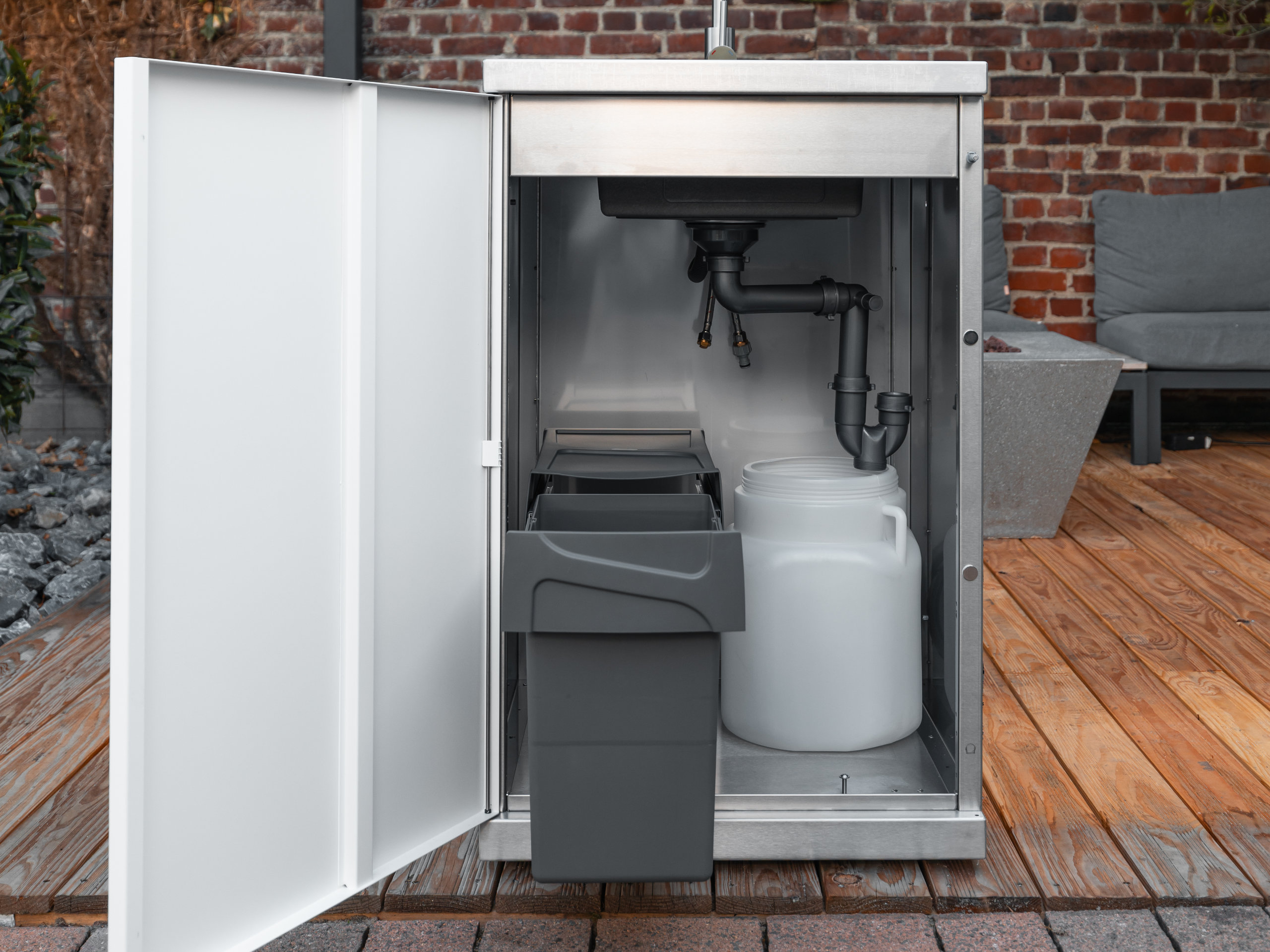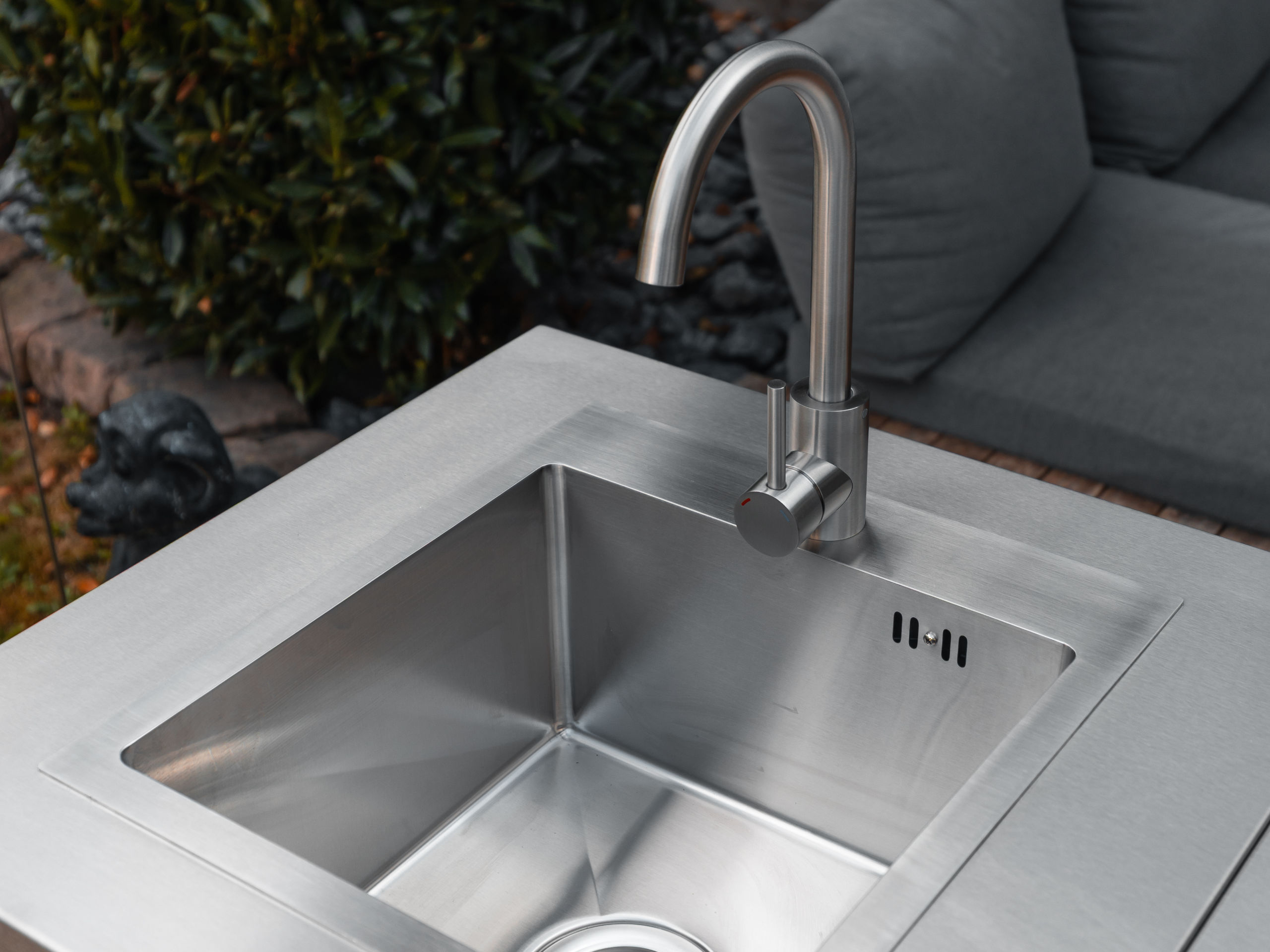Mit dem OKG water one bringst du mehr Komfort in deine Outdoor-Küche. Das Spülen-Modul ist mit einem hochwertigen Wasserhahn und einem robusten Edelstahlbecken ausgestattet – perfekt zum Waschen von Obst, Gemüse, Geschirr oder einfach zum schnellen Händewaschen. Ein integrierter 20 Liter Abwasserbehälter sorgt für saubere Entsorgung, während ein ausziehbarer Mülleimer Ordnung am Grillplatz schafft.